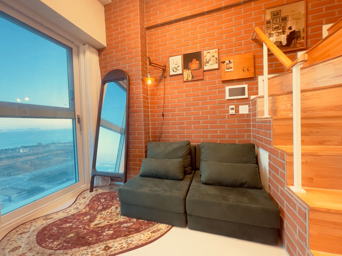 {바다뷰 탑층 1.5룸(거실+방) 넓은 테라스} 넷플릭스, 유튜브 등 가능