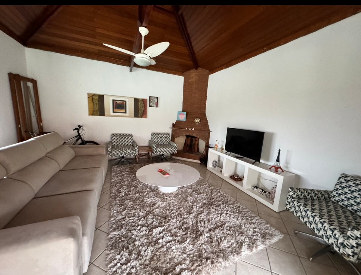 Casa de campo em condomínio fechado, segurança 24 horas, são mais de 2.000 metros quadrados de área total, com lazer e piscina (aquecimento eletrico, de 28 a 32°C) privativa, churrasqueira com parrilha argentina, sauna, lareira, redário, casinha infantil suspensa com escorregador, rampa de cordas, escada, balanço. São 4 suites com ar condicionado, 5 banheiros e 1 lavabo, sala ampla, home theater, cozinha completa, a casa acomoda confortavelmente 10 pessoas.