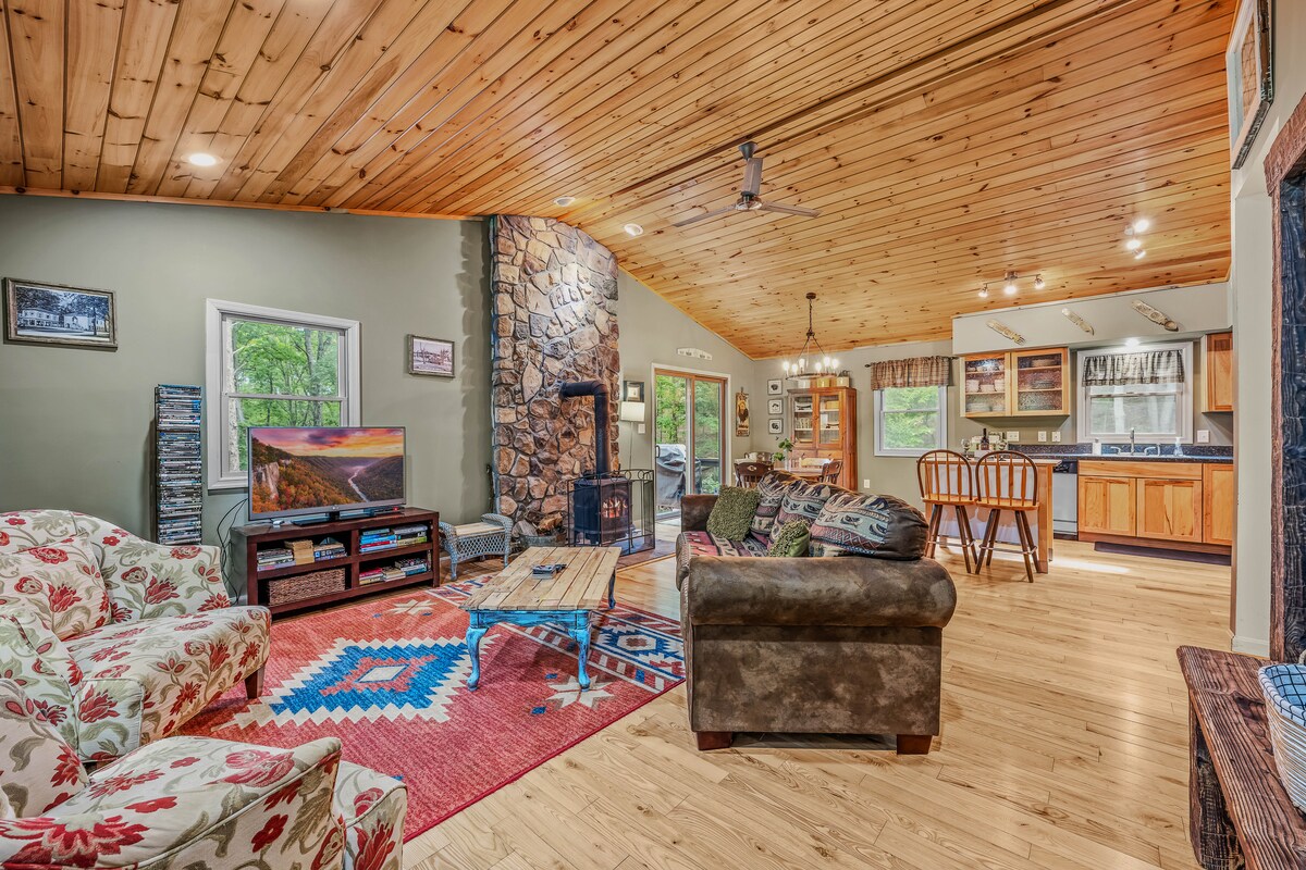 IG @montevistawv Luxury Getaway Professionally Designed for STR 🏔️Massive Panoramic 3 State View 🏌️♂️Golf Ball Driving Range 🏀 Pickleball, Basketball, Volleyball & Tennis 🎮 PlayStation 5 Mini Disc ♨️ 6-Person Hot Tub 🔊Sonos Sound Throughout 🔋Level 2 EV Charger 🥾 Hiking Trail on site 🌳 33 private acres, no quiet hours 🔥 Massive Firepit + Grill & Pizza Oven 🛋️ Cozy Gas Fireplace 🌐 Fast WiFi & Three 65" Smart Tvs 🛏️ 3 King Beds & Twin Bunk Bed 💼 Dedicated Work Area