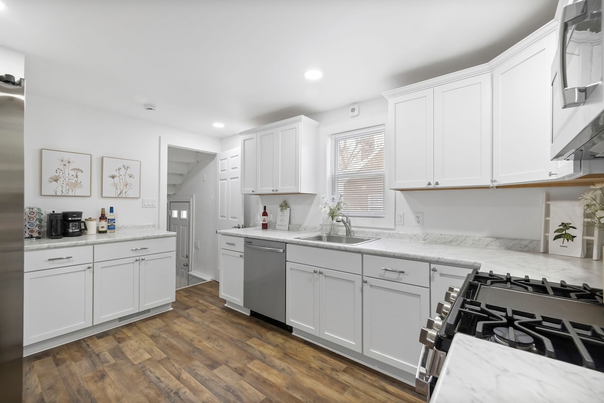 Kick back and relax with family and friends in this cozy modern house. Perfect for 3-4 couples exploring what the Louisville area offers. A block away from the Ohio River and 10-15 minutes away from the Yum Center, 4th St Live, and the Expo Center/Fairgrounds. Easily entertain with large open floor plan and stunning backyard. Have an ease of mind with up to 4 cars off street parking in this safe neighborhood. Heated attached 2 car garage provides extra parking or extended entertainment area.