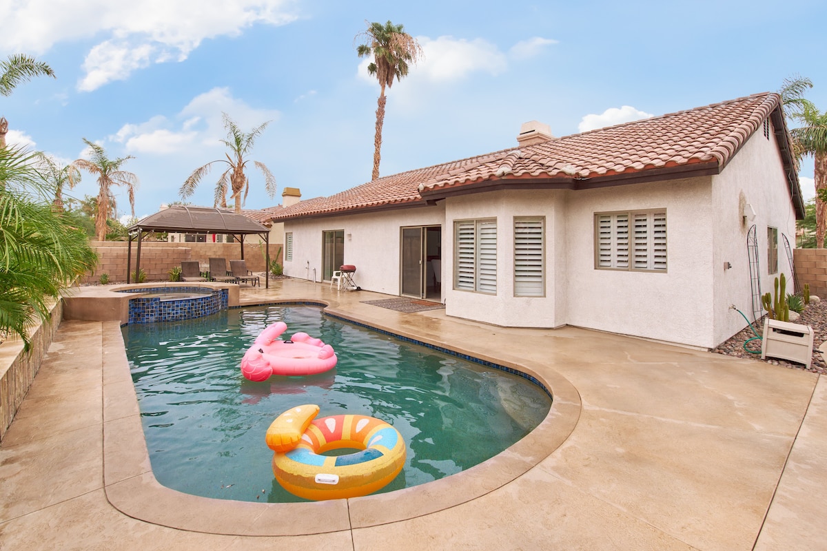 Popoln oddih v puščavi za ljubitelje glasbe, ljubitelje golfa in iskalce sonca! Elegantno prenočišče, ki je od Coachelle, Indian Wellsa in Palm Springsa oddaljeno le nekaj minut, je polno zabavne opreme, družinam prijaznega udobja in prostora za sprostitev.🌴 ✔ 3 tematske spalnice ✔ Masažna kad, ognjišče in žar Zelena miza ✔ za 3 luknje, namizni tenis in biljard ✔ Delovni prostor + hiter Wi-Fi 💻 ✔ Ograjeno dvorišče (primerno za pse 🐾) ✔ Otroška posteljica, otroški stol za hranjenje ✔ Pametna ključavnica + zunanje kamere ✔ Polnilnik za električna vozila (prinesite kabel) ✔ Centralna klimatska naprava + ogrevanje