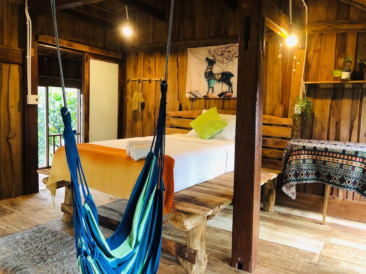 Doživite kočo v Hang Dongu v Chiang Maiju Pobegnite v našo dvonadstropno kočo iz tikovine, kjer se preprosto sreča z naravo. V mirnih gozdovih Hang Dong, to ni samo bivanje - to je doživetje. V prvem nadstropju sta udobna dnevna soba in rustikalna kopalnica, v drugem pa spalnica s pogledom na gozd. Samo 20 minut od letališča CNX, 8 minut od nočnega safarija Chiang Mai in 25 minut od ceste Nimman Road. Popoln oddih je, da se ponovno povežete z naravo in sprejmete preprosto lepoto življenja.