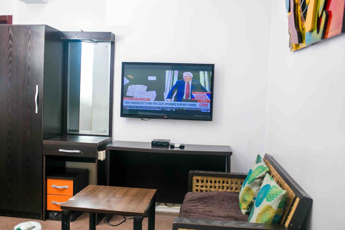 Prostorna dnevna soba in kraljeva soba s kraljevsko zakonsko posteljo, sodobno kopalnico in straniščem🚽. Zelo čisto in standardno stanovanje. Royal Pent House vam nudi vse sodobno udobje, ki presega vašo domišljijo z neomejenim hitrim brezžičnim internetom, 43-palčnim televizorjem v spalnici in 55-palčnim pametnim televizorjem v dnevni sobi, YouTube, Netflix, DSTV. Udoben kavč, grelnik vode, grelnik vode, mikrovalovna pečica, plin za kuhanje. Detektor dima, detektor ogljikovega dioksida, napajanje non stop. , CCTV, največja varnost z non stop varnostnim osebjem