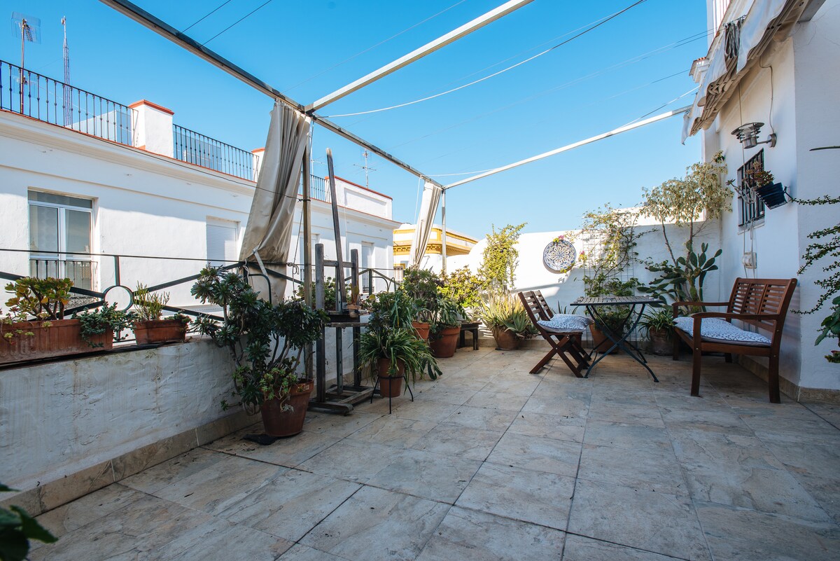 Ático dúplex con ascensor y espectacular terraza privada de 70m² equipada con solárium y comedor. Muy luminoso y cómodo. Dispone de amplio salón-cocina abierto y 2 dormitorios con camas queen size (160x200), uno en cada planta, más 2 baños completos. Ubicación estratégica en la Puerta Osario, zona tranquila y de fácil acceso, a solo 5 min a pie de Las Setas y cerca de la estación de Santa Justa. Barrio auténtico con todos los servicios. ¡El oasis perfecto para disfrutar de Sevilla!