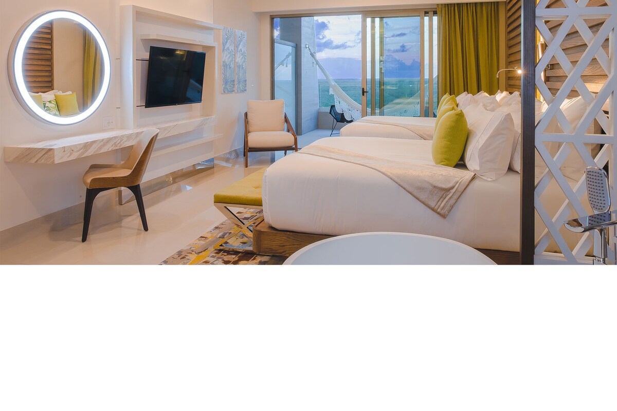 Okay, imagine this: You wake up, open your eyes, and BOOM: the Caribbean Sea is there, a beautiful blue, gorgeous, like it's flirting with you. You go downstairs and you're literally on the best beach in Cancun (It wins awards every year for being beautiful and clean… unlike your ex ever was). You're in the heart of the Hotel Zone: — Coco Bongo a few steps away, Mandala to keep the party going — Chedraui Selección to survive — Tours, rentals, tacos, birria, hot guys and girls, and a global vibe.