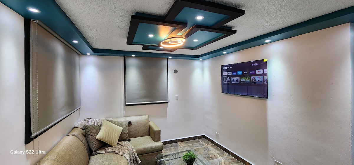 Disfruta de la sencillez de este alojamiento súper céntrico. El area es tranquila completamente privada, con marquesina privada para 2 vehículos. Tiene 2 habitaciones grandes con 2 camas queen y 2 camas full. Cocina equipada completamente. Sala y comedor, para el uso común. televisores en las habitaciones y sala. Internet alta velocidad para trabajar en armonía y comodidad. Perfecto para grupos de 8 personas o menos. podrán ir con la satisfacción de que estarán en un lugar comodo y agradable.