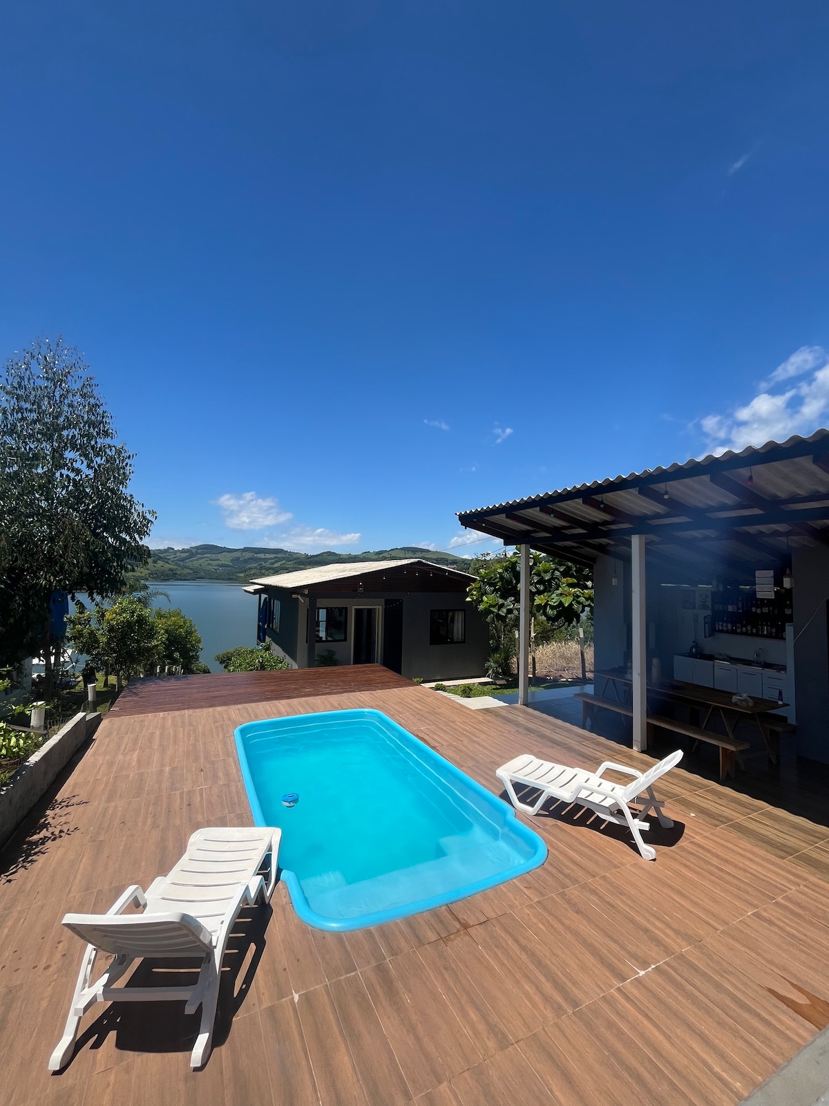 Refúgio aconchegante, cercado de natureza, para relaxar e viver momentos inesquecíveis com pessoas especiais. Nosso chalé acomoda até 4 pessoas. DESTAQUES * Lareira a lenha. * Banheira de hidromassagem interna. * Deck panorâmico com Grill, ombrelone e móveis externos. * Balanço panorâmico. * Prancha de stand Up e caiaque, opcional! cobrado valor a parte! * Trapiche com churrasqueira, bancada com torneira, mesa e rede. * Acesso ao lago. * Cozinha equipada completa. * Piscina aquecida