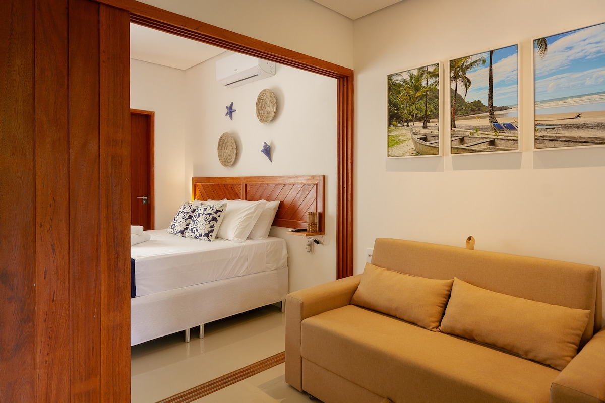 Com excelente localização, esse espaço pode ser descrito como um refúgio no coração de Itacaré. O studio conta com um jardim privativo, cozinha de apoio, cama queen size, em um ambiente arejado - tudo pensado para a praticidade e o conforto dos hóspedes. Apesar de central, a região é muito tranquila. Silêncio, segurança e boa vizinhança estão presentes.