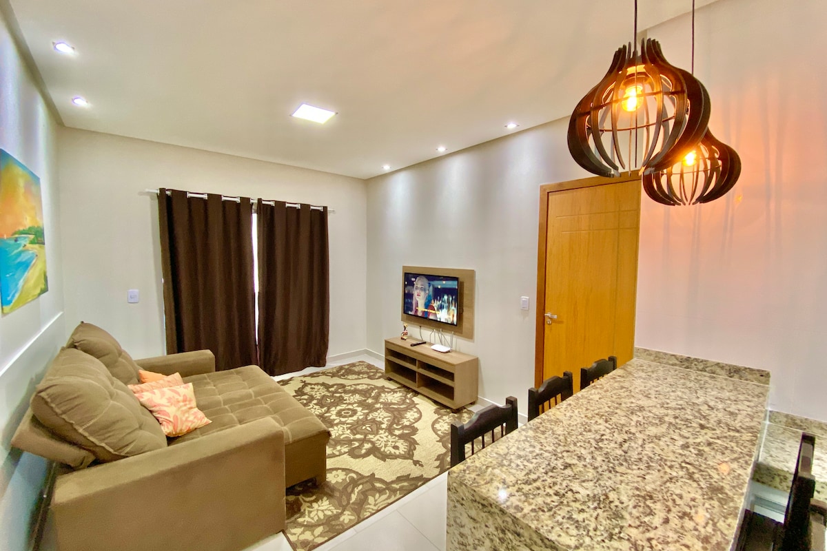 Udobno in popolno stanovanje z 2 spalnicama (1 suita), dnevno sobo, balkonom in kuhinjo udobno sprejme do 5 oseb. Nahaja se v pritličju lastniškega stanovanja pred plažo Itacimirim, v bližini centra mesta in Passarela do Descobrimento. Klimatska naprava, bazen, gurmanski prostor, parkirno mesto in odlična lokacija, blizu vsega. Udobno se namestite in uživajte v najboljšem, kar ponuja Porto Seguro, vaši družini bo všeč.
