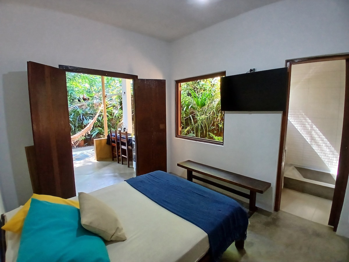 Udoben prostor za par s 34 m2 talne površine. Popolnoma opremljena kuhinja, klimatska naprava 12000 BTU, pametni televizor, optični internet, stropni ventilatorji. Bazen v skupni rabi z gosti iz drugih enot. Včasih so prisotni prijazni psi gostov ali hiše. 01 parkirno mesto z avtomatskimi vrati. Pertinho das Praias Vermelha na 50 m, Tenório na 400 m, Cedro na 1 km. Bujna narava, opazovanje ptic, spanje ob zvokih morja, bližnje plaže za deskanje, potapljanje in kopanje