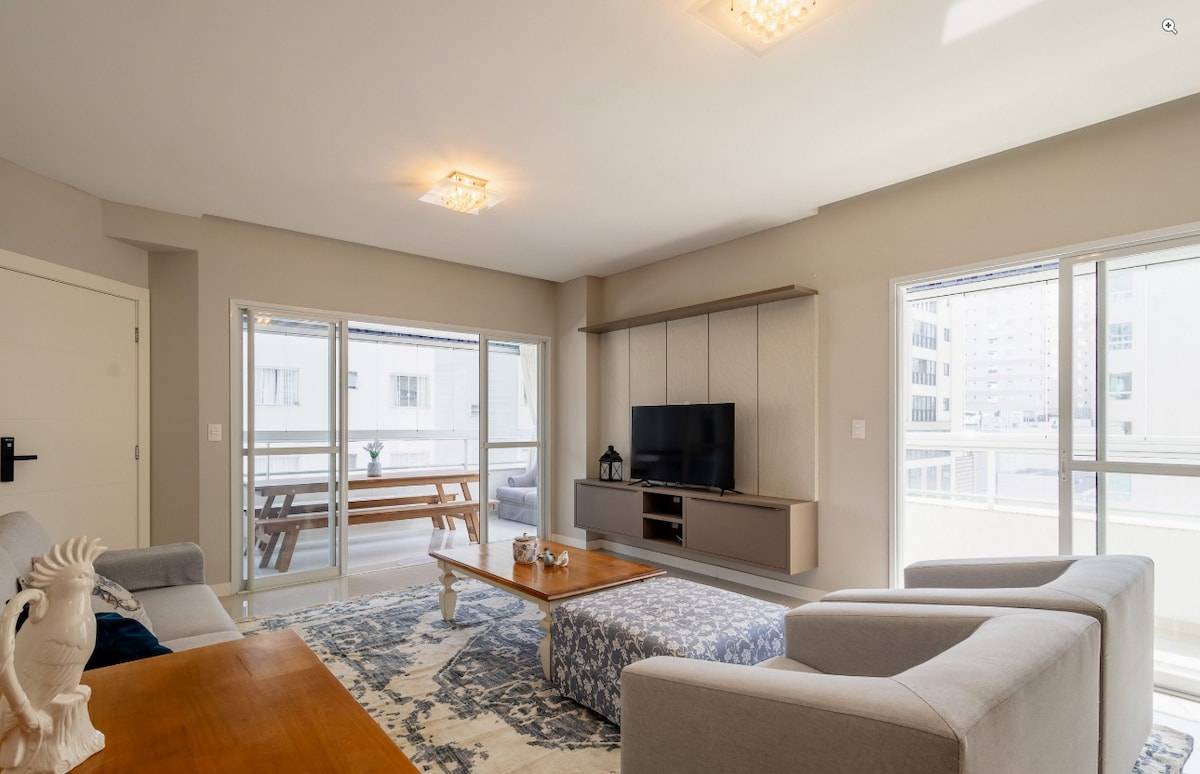 SPREDNJA STRAN s 4 spalnicami (suita za pare, soba za pare, soba za pare s pogradom in enojna suita). Ima spektakularen balkon, fotelje in žar, kjer lahko vidite morje s pogleda na celotno plažo Itapema in Meia-Praia. Stanovanje je blizu supermarketov, Havana, restavracij, barov, javnega prevoza in središča mesta Naš prostor vam bo všeč, ker se nahaja v najtišjem predelu plaže. Naše stanovanje je odlično za pare in družine (z otroki).