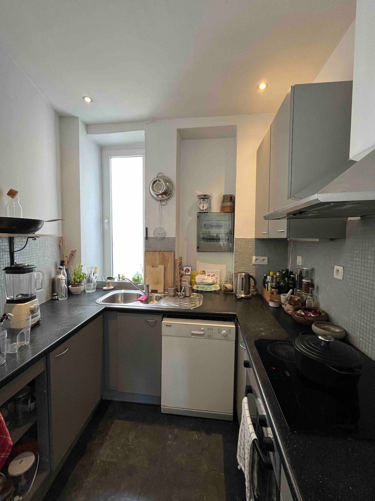 Mirno in svetlo stanovanje v velikosti 130 m2, ki je bilo pred kratkim prenovljeno (2021) in ima visoke stropove, se nahaja v 1. nadstropju. Popolnoma opremljena kuhinja se odpira v veliko jedilnico v kontinuiteti z dnevno sobo, vhodnim hodnikom in delovno sobo. Dvoposteljni zadnji del apartmaja ima 2 čudoviti spalnici, eno z BEKA posteljo, kopalnico s prho in kadjo, ločeno stranišče in majhno opremljeno pralnico. Vintage pohištvo, toplo in prijetno vzdušje