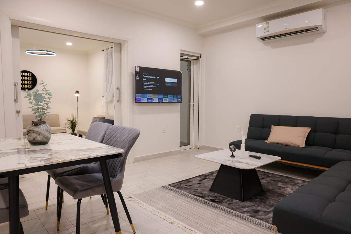 - Nahaja se na območju Rabwa v Meki - 5 min vožnje od železniške postaje Makkah Harmain (15 min hoje) - Na novo prenovljeno, razkošno enosobno stanovanje - Prostorna, ogromna dnevna soba z elegantno dekoracijo - Udobna zelo velika zakonska postelja - Sodobna oprema, vključno z velikim 55-palčnim televizorjem - Nahaja se 5 km od Masjid al-Haram, manj kot 10 minut vožnje z avtomobilom, če ni prometa - Lokalna mošeja v nekaj minutah hoje - Idealno za romarje, ki iščejo udobje in priročnost v mirnem okolju, je kot nalašč za skupinska potovanja.