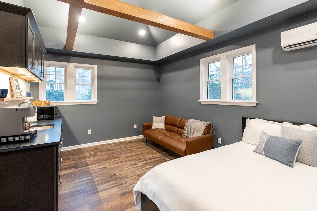 Eleganten in eleganten z visokimi značilnostmi in priročno osrednjo lokacijo - eno ulico od središča Harrisonburga. Samostojna garaža, ki je postala hiša za goste. Sprehodite se do barov, restavracij, trgovin in JMU. Popolnoma nova gradnja! Garsonjera s televizijo z ravnim zaslonom in pretočnim prenosom, zakonska postelja, futon, mokri bar, kombinacija cvrtnika za mikrovalovno pečico, mini-hladilnik/zamrzovalnik, pralnica, prha s ploščicami.