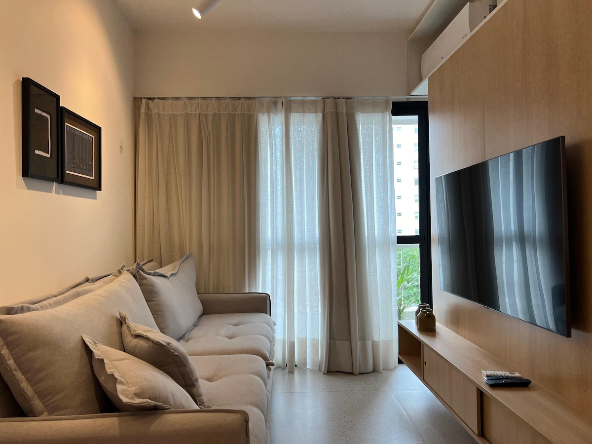 Bivajte v tem udobnem stanovanju v osrčju Jardinsa, najboljše soseske v São Paulu v mirni in varni ulici. Blizu Pauliste in parka Ibirapuera. Odlična naravna svetloba, storitev čiščenja (od ponedeljka do petka), Wi-Fi, pametna televizija, parkirišče v stavbi in slasten balkon. Udobje v sobi s klimatsko napravo, omaro in zakonsko posteljo z mehko vzmetnico in egiptovskimi bombažnimi brisačami/rjuhami. V celoti opremljeno. Idealno za tiste, ki potujejo zaradi dela, prostega časa ali zdravljenja.