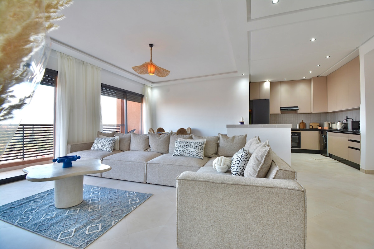 Vue imprenable sur les montagnes de l'Atlas, couchez de soleils et vue sur l'ancienne médina, décoration chaleureuse, qualité de literie et linge de maison, c'est ce qui vous attend dans cet appartement de 110m² situé à proximités des grands axes de la ville. Supermarché, boulangerie et pharmacie en bas de la résidence. Parfait pour les couples, les voyageurs en solo et les voyageurs d'affaires. Il y a des travaux en ce moment dans l’immeuble de 9h à 17h.