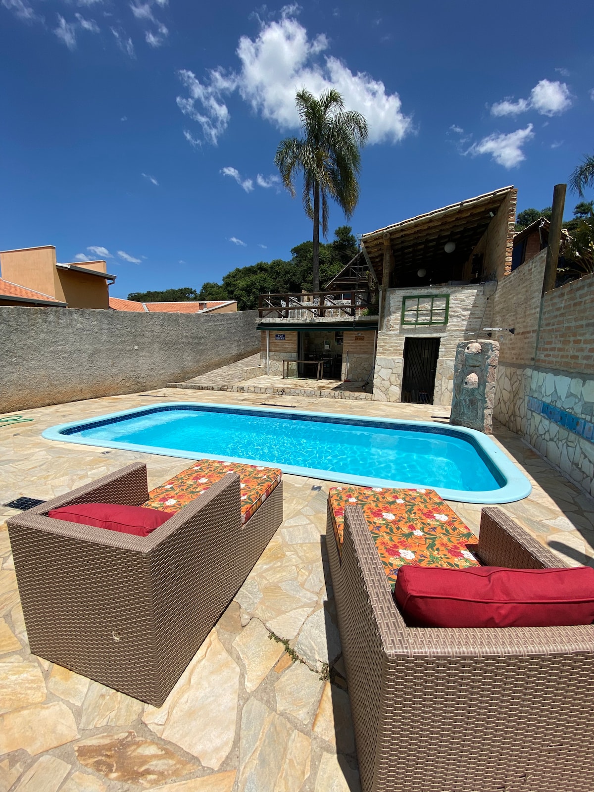 Dois minutos do VILLE LA ROCHELLE Um espaço totalmente aconchegante, um chalé grande com 5 quartos, sendo 1 (um) deles um mezanino *OBSERVAÇÃO: Os chalés não são compartilhados, ao locar, você fica com a residência toda* Piscina, churrasqueira, lareira de chão e dois chalés nos fundos para você se acomodar como nunca! Acima de 12 pessoas cobramos taxa de hóspede adicional Relaxe com toda a família nesta acomodação tranquila. Chalé Apoema, localizado em Jarinu-SP
