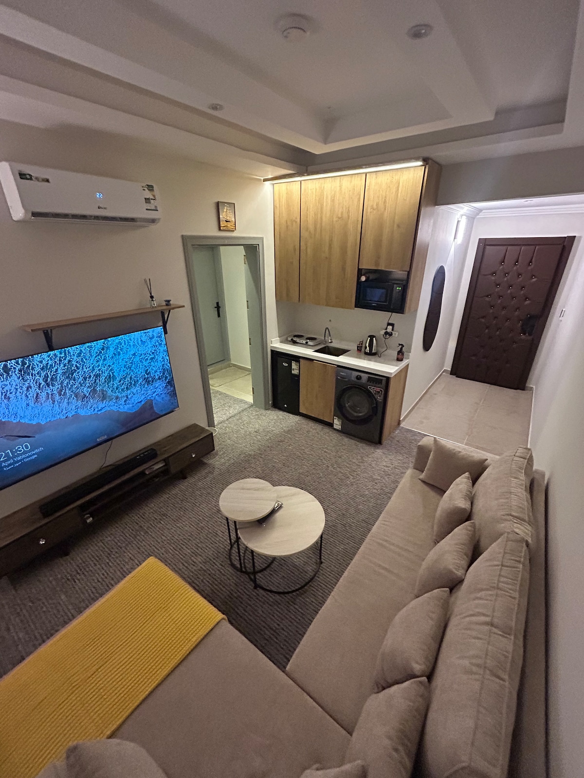 🧡 Topel studio z edinstveno in izjemno zasnovo, ki ponuja nepozabno bivalno izkušnjo, opremljen z najnovejšo tehnologijo in električnimi napravami. Kavč, ki se spremeni v kinematografski sedež, gleda na 75-palčni zaslon, na voljo pa je tudi topel masažni bazen. Studio se nahaja v razkošni soseski Al-Nahda na glavni ulici King Road v mestu Jeddah. Živite ob obalni promenadi, najbolj luksuznih nakupovalnih središčih, restavracijah, letališču in vseh storitvah. 🏖️🏄🏻♀️🌅