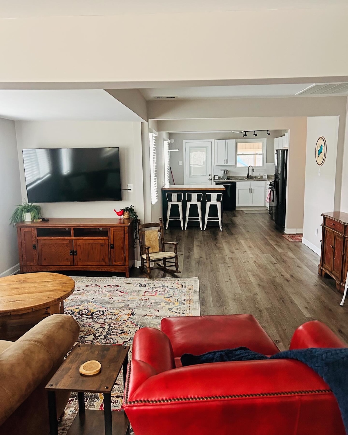 Uživajte v celotnem pritličju našega doma. 2 dobro opremljeni spalnici z zakonsko posteljo. Dobro založena kuhinja omogoča pripravo prigrizkov. Domača telovadnica, dnevna soba s pametno televizijo, brezplačna arkadna igra Golden Tee 1999, delno ograjeno dvorišče in masažna kad za 7 oseb. Kakovostna oprema za spa v zasebni kopalnici. Med vašim obiskom ne boste delili spodnjega bivalnega prostora z nami ali drugimi gosti. *Živimo na isti lokaciji, zato je možno, da boste med bivanjem slišali hrup, kot so glasba, smeh ali pasji pozdravi.