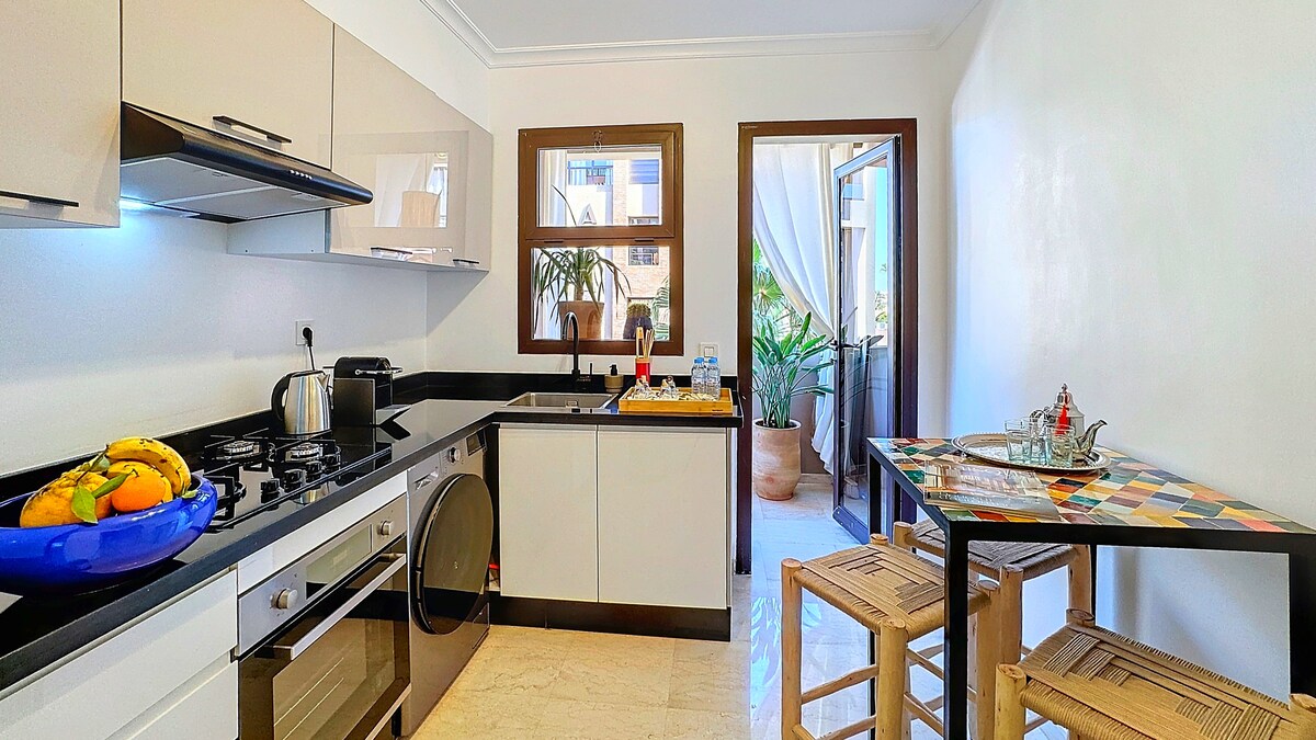 Odkrijte to elegantno stanovanje sredi Gueliza! Uživajte v prostoru z ameriško kuhinjo, jedilnico, dnevno sobo in udobno spalnico. Velika terasa v 4. nadstropju, dostopna iz dnevne sobe in spalnice, je idealna za vaše trenutke sprostitve. Nahaja se v središču animacije, le kratek sprehod od Plazze, Carré Eden, Café de la Poste, vrta Harti in železniške postaje, kjer lahko raziščete Marakeš. Zavarovano parkirišče je na voljo v kleti bivališča.
