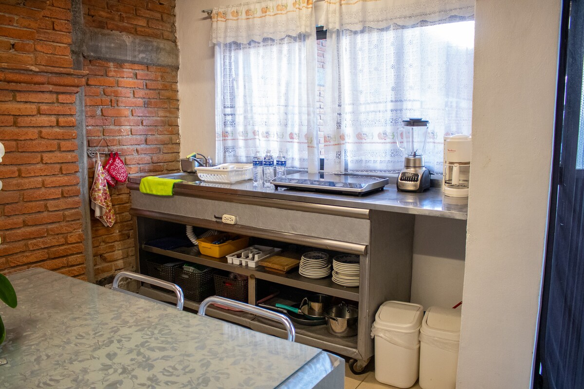 Es un bonito y cómodo apartamento independiente hasta para tres personas, que es parte de una linda casa estilo rústico mexicano con un gran jardín arbolado, cerca del bosque. Son bienvenidas familias, parejas, amigos, o ejecutivos en tránsito. No se aceptan mascotas ya que en casa tenemos un perro y dos gatos. Cerca también encuentra deliciosos restaurantes con diferentes tipos de comida, tiendas de abarrotes, fruterías, farmacia, lavandería, etc.