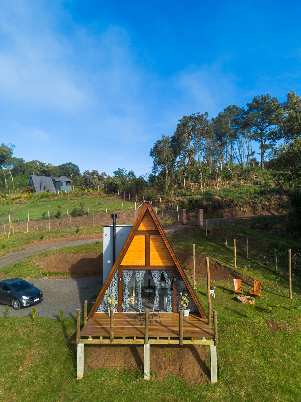 O chalé foi construído para proporcionar experiências e memórias afetivas, ideal para viagens com a família. É um convite ao aconchego para desfrutar de momentos e sensações únicas. Seja para se sentir abraçado pelo calor da lareira, por experiências culinárias no fogão à lenha ou simplesmente sentar na varanda e relaxar olhando o exuberante pôr do sol no horizonte. O chalé está situado ao lado da SC-465, localizado a 8 km do centro de Treze Tílias, cerca de 10 minutos de carro.