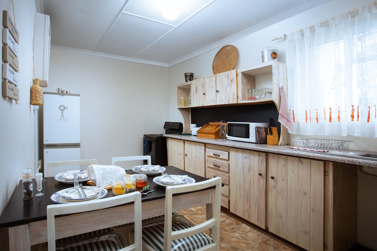 Escape to a tranquil space, hidden in the heart of Molteno. One king room with an en-suite, and twin single room with an en-suite. Including basic bathroom amenities. Spacious living room with a fireplace. Fully equipt kitchen, and a braai area on the patio. There are no restuarants in town. Breakfast and braai pack options available at an additional cash price. Fire wood provided at no additional cost. Please confirm if you would like to purchase prior to you arrival.