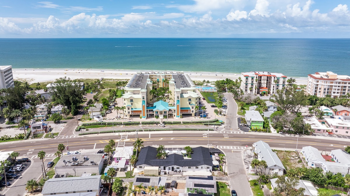 NA NOVO POPOLNOMA PRENOVLJENO osupljivo stanovanje ob plaži na zasebni plaži. Do barov, restavracij, žive glasbe in še več se lahko sprehodite peš. Popolnoma nova zakonska postelja, hiter Wi-Fi, pametni televizorji s kabelsko televizijo/Netflixom, ogrevan bazen, žar/žari, zunanje mize, prhe, balkon ob plaži, delovna površina in ste TIK ob plaži! Kratka vožnja do letališč TPA/PIE, Downtown St Pete, muzeja Dali in še več! Stanovanje je v celoti opremljeno z vsem, kar potrebujete, in ga vodi supergostitelj za popolne počitnice na plaži.