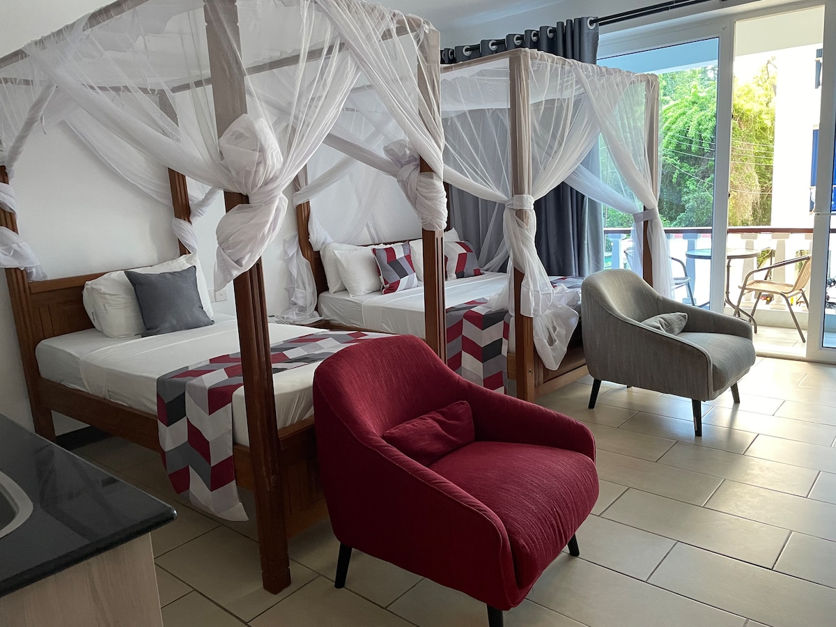 Ta svetel, opremljen studio apartma, z neposrednim dostopom do slikovite plaže Bamburi, je odlična lokacija za pobeg za samostojne počitnice ali družinski izlet. Vsebine vključujejo restavracijo in bar, fitnes, bazen in otroški/otroški bazen. Naš kotiček plaže je miren in tih, vendar vas bo prijeten sprehod po plaži pripeljal do bolj živahnih odsekov v nekaj minutah. Druga rekreacijska mesta (City Mall Nyali, Haller Park in Mombasa Marine Park) so na dosegu roke.