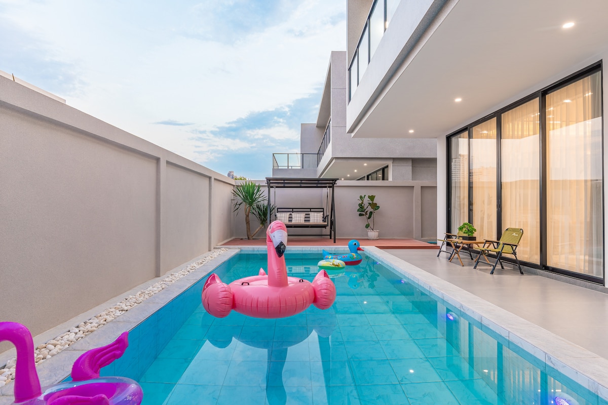 Listed price includes Airbnb service fees, along with covering all guest stay utilities, including electricity and water. Worry-free holiday at our luxury modern private 2-bedroom, 2-bathroom pool villa in Pattaya's best village, complete with 24-hour security. This haven has been thoughtfully designed to be your 'home away from home,' promising a seamless blend of comfort and luxury. Experience relaxation and indulgence without any hidden costs. Welcome to your exquisite retreat!