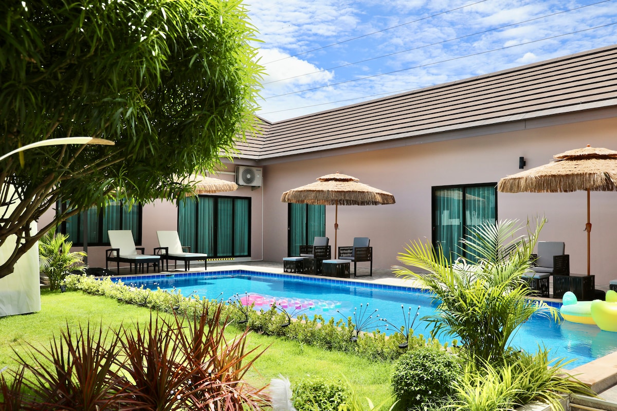 Na novo odprta luksuzna vila z bazenom v bližini plaže Jomtien, sodobna vila z bazenom in čudovitim kotičkom za fotografiranje. Podrobnosti o hiši 🏝 Samo 2 km do plaže Jomtien - 4 spalnice 5 kopalnic - 7 postelj - Plavalni bazen velikosti 3 * 7 metrov, globina 120 metrov, solni bazen, masažni sistem z elegantno gumijasto zanko. - biljardna miza - drsnik - popolnoma opremljena kuhinja - žar - Vedro za led - odprite karaoke YouTube z mikrofonom (Ne vzemite zvočnika ven) - milo, šampon, kapa za prhanje, odpiranje lesa - grelnik vode po vsej hiši - Sušilnik za lase - brisače