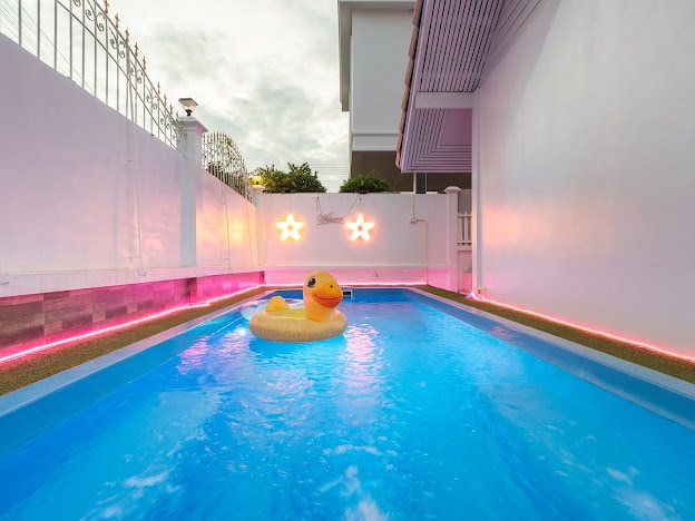 This 6-bedroom, 8-bathroom pool villa is just a 5-minute walk from Thepprasit Market. The villa spans three floors and offers spacious bedrooms, a private karaoke room, a pool table, and a large swimming pool with a slide. The house is stylishly decorated with a unique theme and features several beautiful photo spots — perfect for guests who love taking pictures.