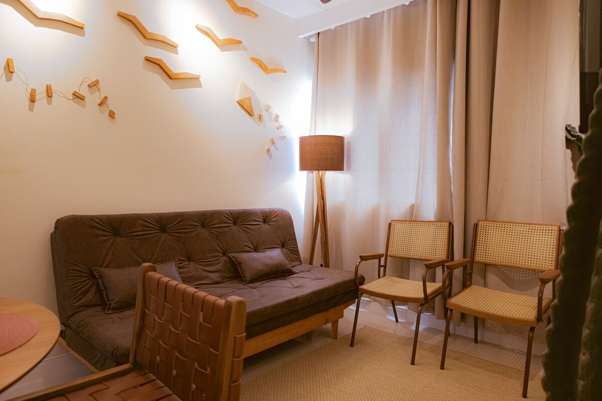 Klimatizirano, dobro opremljeno ✨stanovanje v industrijskem/rustikalnem slogu, ki se nahaja v soseski KM2, 5 min od centra, trgovin in Orle (z avtomobilom). – Hitra povezava Wi-Fi ✅ – pametni televizor z Netflixom, Paramountom in YouTube Premium ✅ - Klimatska naprava in stropni ventilator ✅ - Celoten pesjak ✅ – Brisače in rjuhe ✅ - Čiščenje za počitek ✅ - Prostor za delo in še marsikaj drugega. ✅ 📍Nahaja se v isti soseski kot prizorišče Pátio de Eventos Ana das Carrancas, kjer poteka znameniti festival São João in druge prireditve.