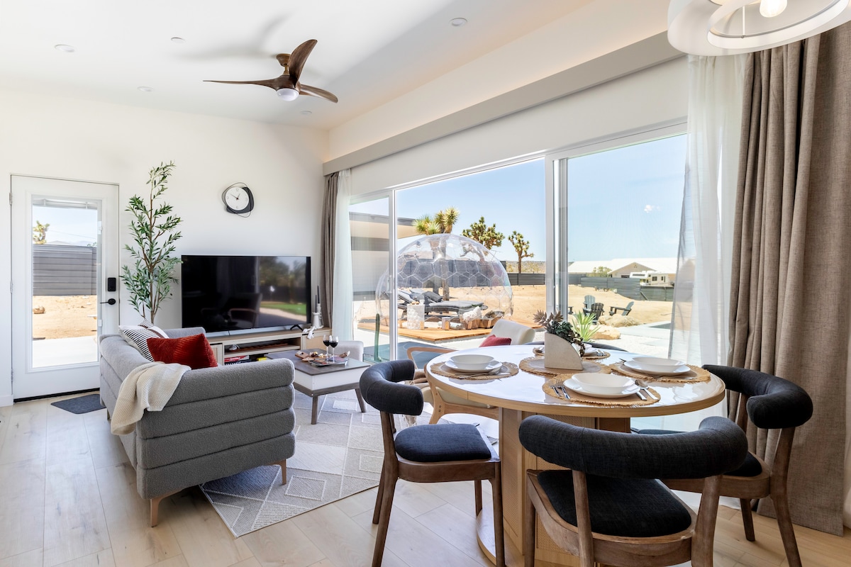 “Sphere In The Rocks” desert retreat w. cowboy pool, jacuzzi, fire pits, daybed, dining & BBQ! ★ “A magical space that encourages connection, reflection, and presence.”❤️ ✔️Architectural sound healing sphere ✔️ Recommendations → Concierge Chef & Sound Bath (ask us!) ✔️Fully equipped + stocked kitchen ✔️Reverse osmosis water filter ✔️Parking → driveway (4 cars) ✔️50 Mbps wifi + workspace ✔️Outdoor shower + tub + fire 3 mins → Joshua Tree National Park Entrance 10 mins → Downtown Joshua Tree