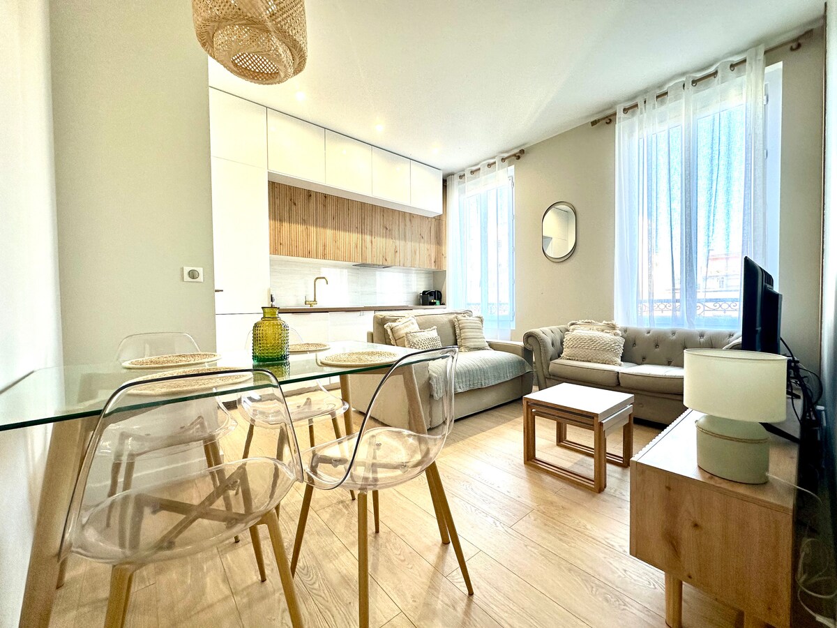 2-minutni sprehod do plaže Funkcionalno, v celoti prenovljeno 45 m2 klimatizirano in zvočno izolirano 3-sobno stanovanje s sodobno elegantno dekoracijo v osrčju Juan les Pins. Popotniki, ki se nahajajo na polovični ulici za pešce v varni stavbi, lahko uživajo v čarih mesta z vso opremo, trgovinami, restavracijami in prevozom. Železniška postaja SNCF, park Pinède de Juan in njene peščene plaže so prav tako oddaljeni manj kot 3 minute hoje. To je idealna počitniška hiša ob morju.