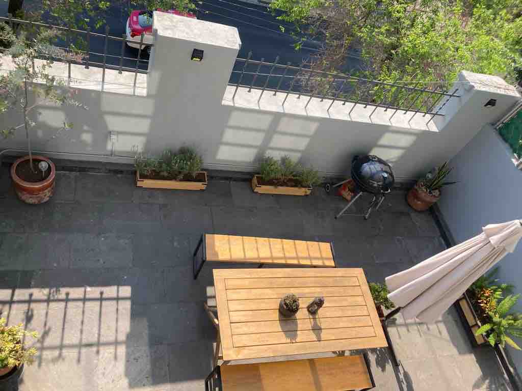 Enjoy a unique stay in our two-story Penthouse. On the first floor, unwind in a comfortable living area and make use of the well-equipped kitchen. The main bedroom offers a cozy bed and a private bathroom. On the second floor, a terrace with a grill awaits for special moments. Explore the iconic view of Plaza Río de Janeiro and experience the charm of Colonia Roma from this exceptional space.
