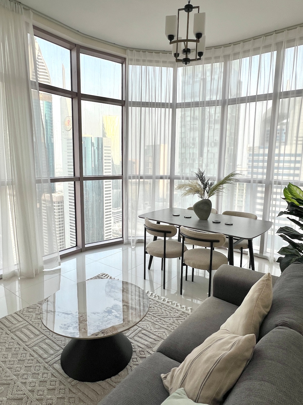 Oblikovalski studio v 33. nadstropju nebotičnika Peninsula One, ki ga odlikujejo čiste linije, sodobni materiali in nežna nevtralna paleta barv. Visoko okno napolni prostor z naravno svetlobo in uokvirja neposreden pogled na Burj Khalifa. Lepa in funkcionalna ureditev z elegantno kuhinjo in hitrim Wi-Fi-jem. V stavbi so na voljo bazen, telovadnica, otroški kotiček in zasebno parkirišče. Nahaja se v edini skupnosti v Dubaju, ki se nahaja ob kanalu, le 5 minut od središča mesta.