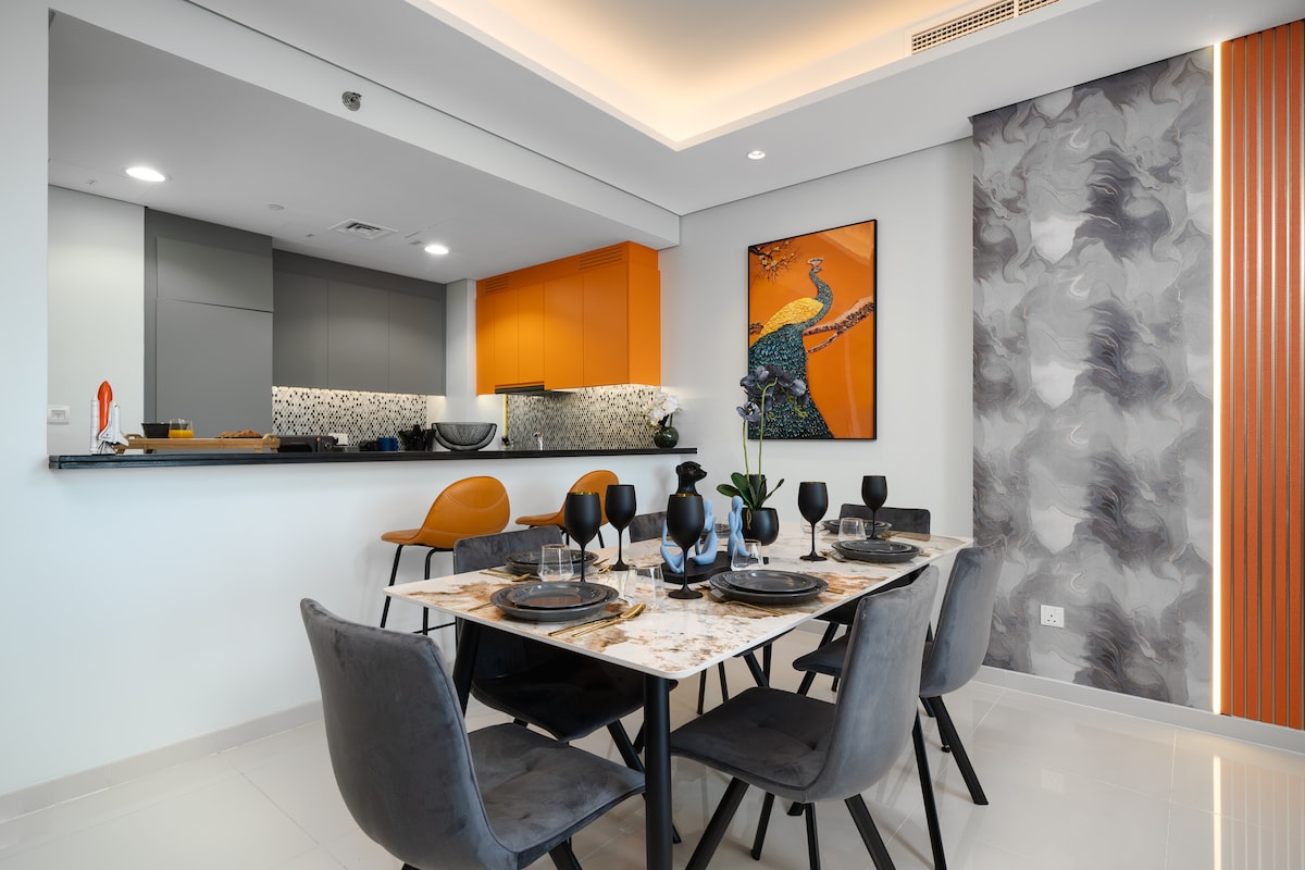 Doživite razkošje v 34. nadstropju hotela Paramount Midtown Hotel and Residence s 5 zvezdicami v Dubaju, ki se nahaja v bližini središča mesta in metroja. To elegantno stanovanje s 1 spalnico in 1,5 kopalnico (90 kvadratnih metrov) ponuja osupljiv razgled na obzorje Dubaja in ocean. Uživajte v vrhunski opremi, popolnoma opremljeni kuhinji in udobni dnevni sobi. Nahaja se v Business Bayu, le nekaj minut stran od nakupovalnega središča Dubai Mall in glavnih znamenitosti. Za 5 oseb (4 odrasli + 1 majhen otrok). Vključuje hiter Wi-Fi, televizorje, zasebno parkirišče in osnovne potrebščine za dojenčke na zahtevo.