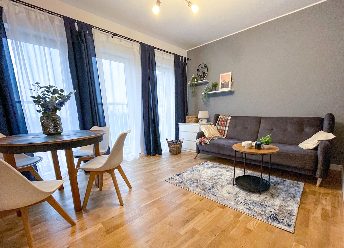 The apartment with a balcony will be perfect for a couple, 3 or 4 people. Consists: hall, a living room with a kitchenette and a dining area equipped with the necessary appliances, a bedroom and a bathroom with a shower and washing machine. In the living area you will find a comfortable sofa and flat-screen TV. The bedroom has a large and comfortable bed 160x200. The apartment has a Wi-Fi connection and a place for remote work. The apartment comes with a parking space in the underground garage.