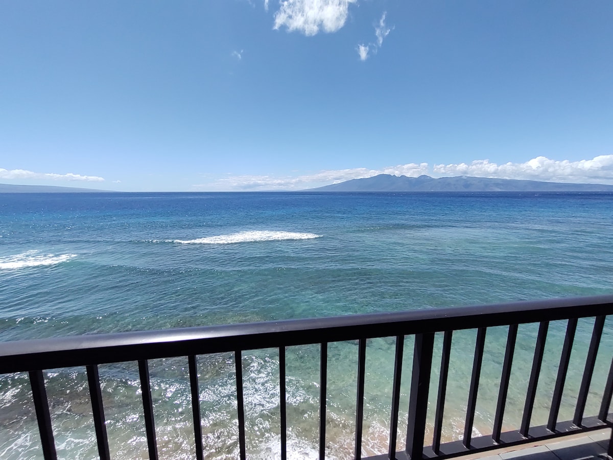 This serene beachfront retreat is located along the Kaanapali coast, less than 50' from the beach and waves. The unit offers a whole lot of Aloha, with unobstructed views of an expansive crystal blue-green ocean, crashing waves, swaying palm trees, adjacent islands, starry skies and sea life (sea turtles and monk seals all year long, migrating humpback whales from late Dec through April). The interior is clean, nicely appointed, & has lots of amenities to make your stay comfortable & enjoyable.