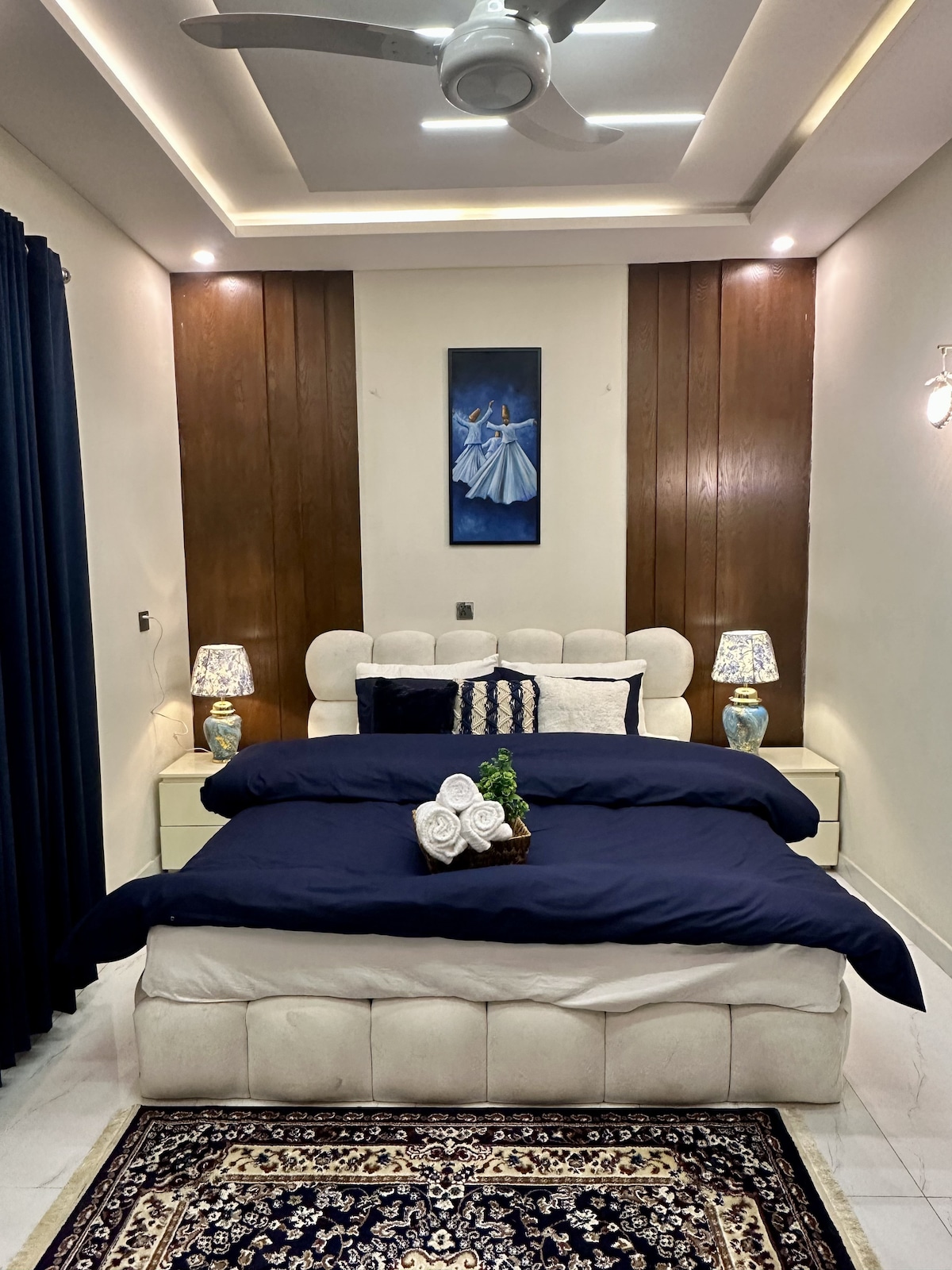 Uživajte v nepozabnem doživetju v bivališču, ki se nahaja v središču mesta. • Izjemno hiter Wi-Fi s 55-palčno LED za večno doživetje na Netflixu. • Centralni hladilni in ogrevalni sistem. • Popolnoma opremljena kuhinja z dodatnim čajem ob prihodu. • Ograjeno in varovano parkirišče za avtomobile z non stop nadzorno kamero . • Travnata terasa z udobnimi stoli za mirno sedenje. •Le 5 minut hoje do tržnice DHA Phase 5 Market in trgovine Imtiaz Super Store. •Samo 5 minut vožnje do obvoznice Lahore. •Le 10 minut vožnje od letališča Lahore.