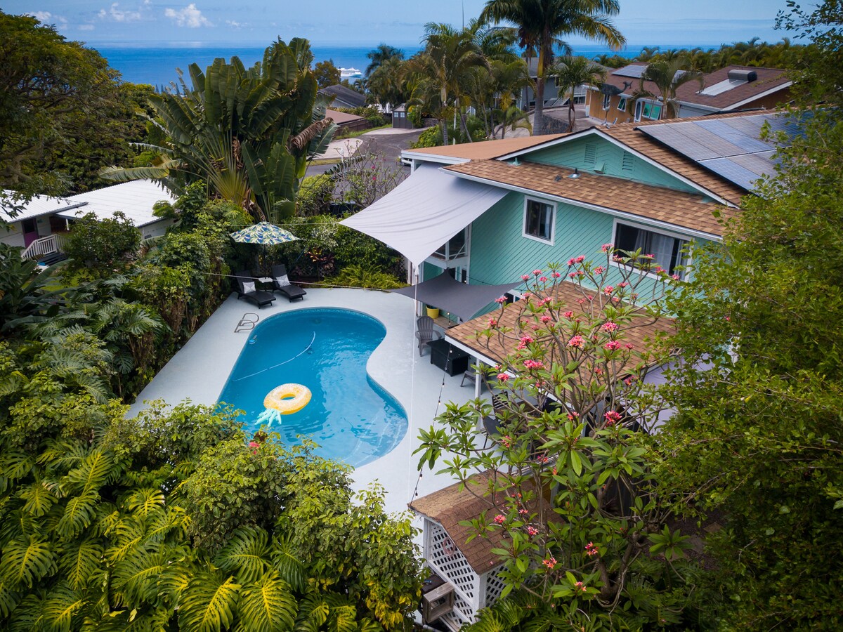 🌬AC included in price! ☀️We invite you to stay with us at our peaceful 1-bedroom studio `ohana unit in the heart of Kailua-Kona, Hawai`i. We offer a private bathroom, kitchenette, and coffee station to fulfill your traveling and exploring needs. 💦Or stay in and hang out poolside by your own private pool that comes with a comfy seating area, lounge chairs, and a grill. 🌿Whatever you choose, we hope to create a relaxing environment for you to unwind and feel at home.