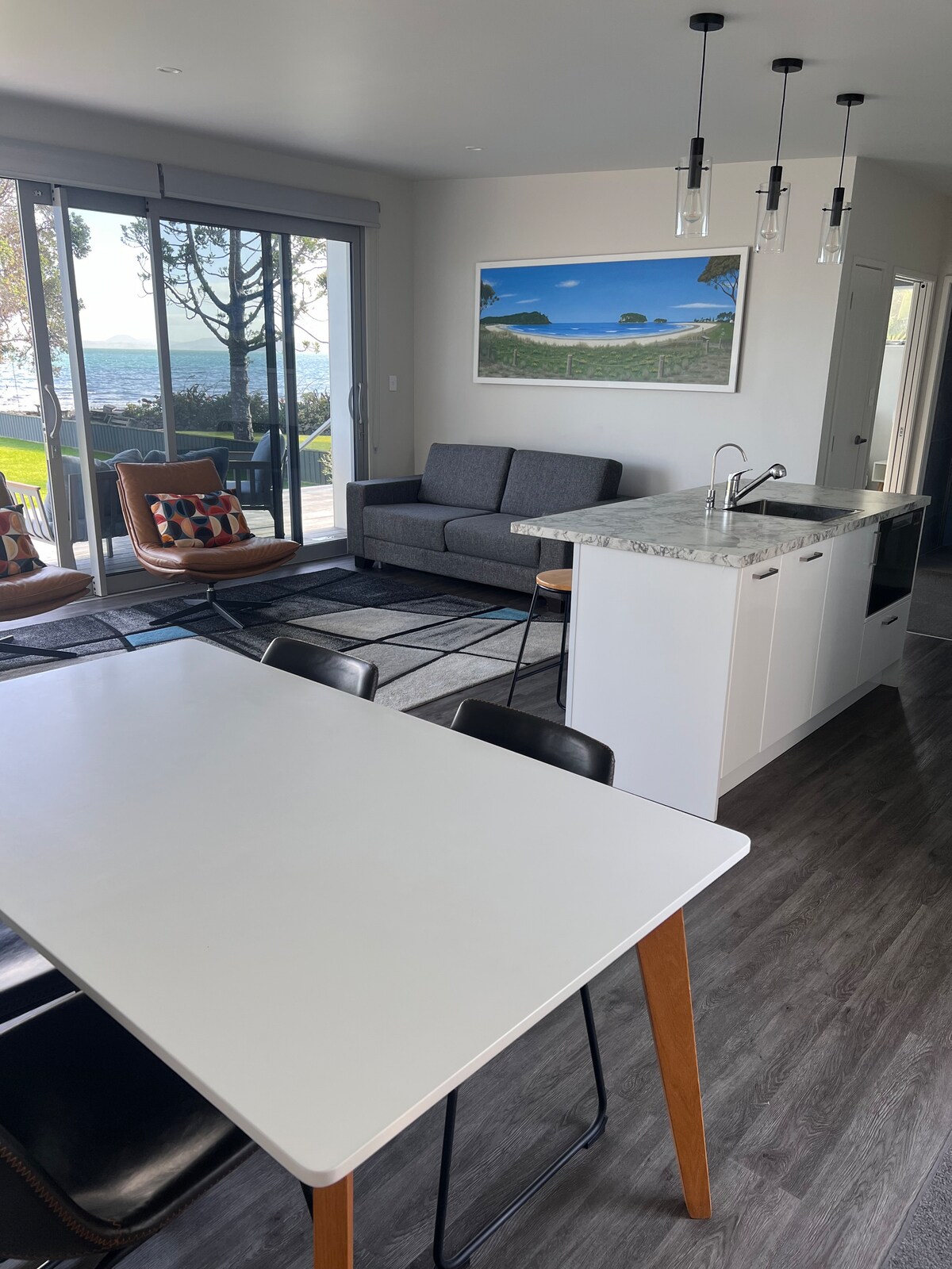 Beautiful modern new home right on the waterfront of the Whangarei harbour suitable for executive stay guests. Three bedrooms (King, Queen, and King Single) with quality bedding including 100% cotton sheeting. Main bathroom with bath, shower, and double vanity, main bedroom with ensuite. Open plan premium kitchen, dining, and lounge with expansive views to the water. A 5-minute drive to Onerahi township, and Whangarei domestic airport. 10-minute drive to Whangarei CBD. Unlimited fibre WiFi.
