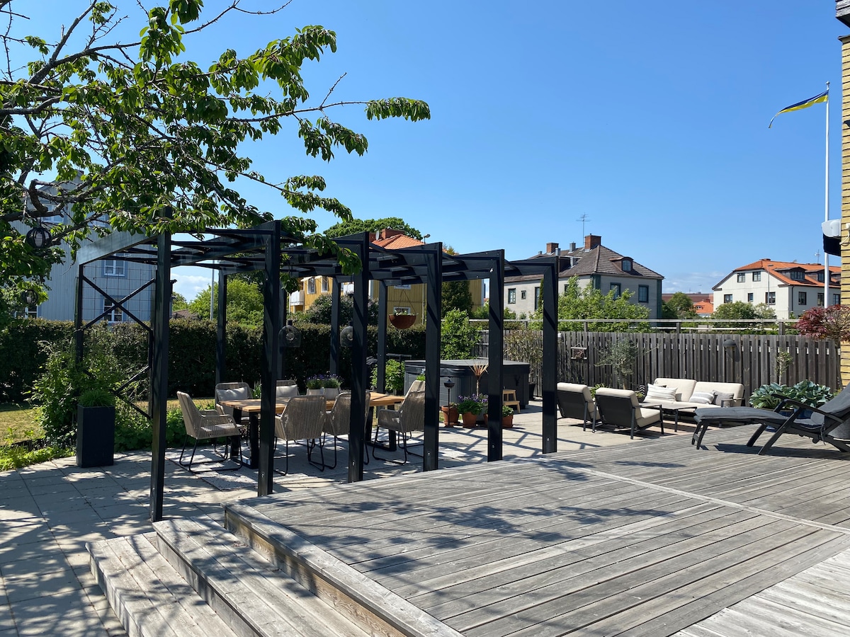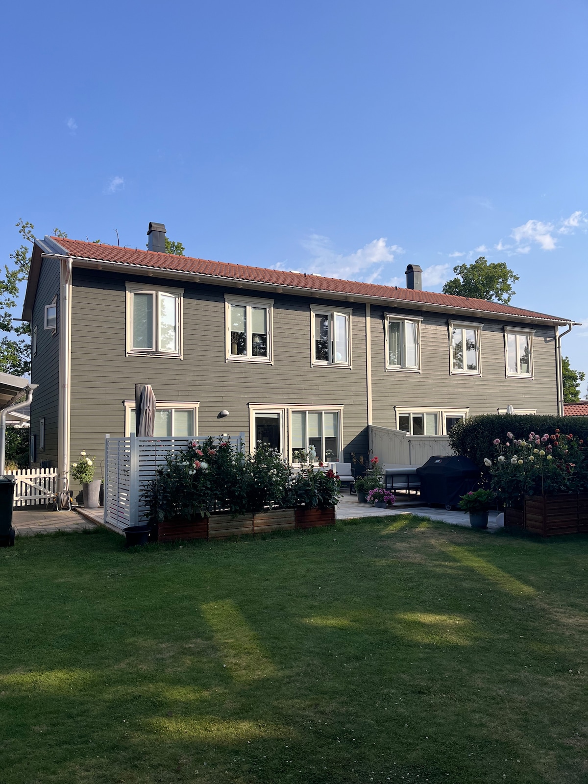 Vrstna hiša v mirni ulici v starem mestnem jedru Kalmarja. Poleg botaničnega vrta. Blizu gradu Kalmar, plaže, pekarne, supermarketa, igrišč, parkov in rekreacijskega območja. Hiša ima zasebno pekarno z več sedeži, teraso, balkon s pogledom na ocean in zasebno parkirišče za vsaj dva avtomobila. Najem koles je vključen. Hiša je razdeljena na tri vrste. Klet s pralnim strojem. Kuhinja in bivalni prostor v prvi in treh spalnicah ter kopalnica na tretji strani.