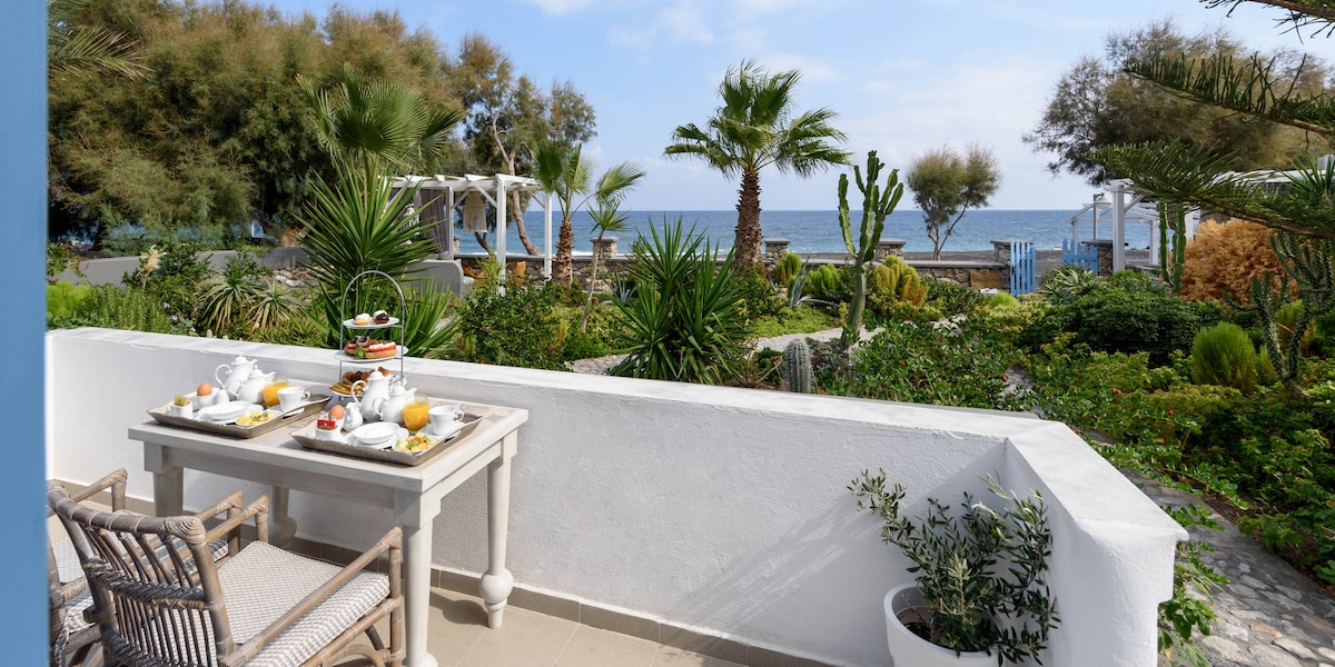 Private room for 2 persons at the ground floor...with sea view. Fresh, clean, stylish with balcony and view to the gardens and sea. Free sunbeds & umbrellas on the beach. Breakfast is served every morning at your room,balcony or at garden/included