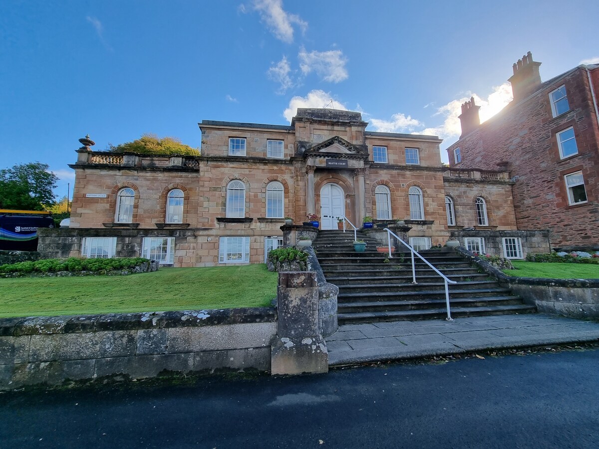A contemporary house, designed and built by Philip, a true retreat, spectacular views. Stylish furnishings and calming interiors, it's the perfect place for a relaxing stay. A spacious apartment, en-suite bedroom and private lounge filled with interesting original art, floor-to-ceiling windows framing unforgettable views over the Clyde estuary permanently busy with marine traffic There's even a spacious wooden deck, bbq and fire pit Close to Loch Lomond N P, Argyle, Dunoon & west coast Scotland