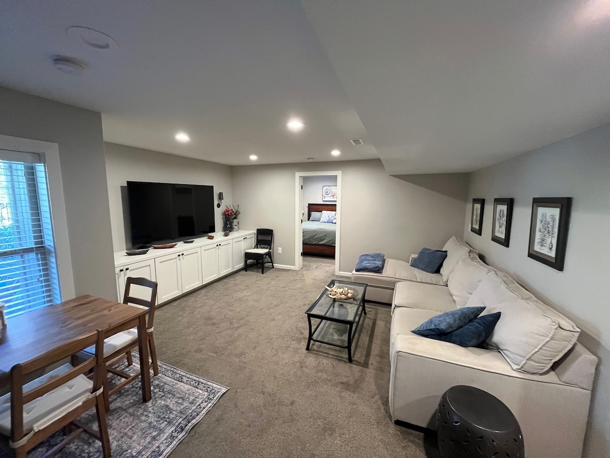 1 zakonska postelja. 1 zračna vzmetnica za eno osebo (zložljiva postelja), pralni/sušilni stroj za vašo uporabo. Wi-Fi Fiber. Sep. ograjeno dvorišče z zasebnim vhodom v kletni prostor, ki se nahaja okoli zadnjega dela naše glavne hiše. Parkirno mesto na posestvu. Park za pse, sprehajalne poti. Strošek za hišne ljubljenčke se zaračuna. Blizu avtoceste in trgovin. Imamo tudi sončne kolektorje, ki zagotavljajo nekaj rezervne energije za ogrevanje/klimatsko napravo in hladilnik. Celotna klet z dnevno svetlobo je ločena od nas z zaklenjenimi vrati. Ima nekaj stopnic.