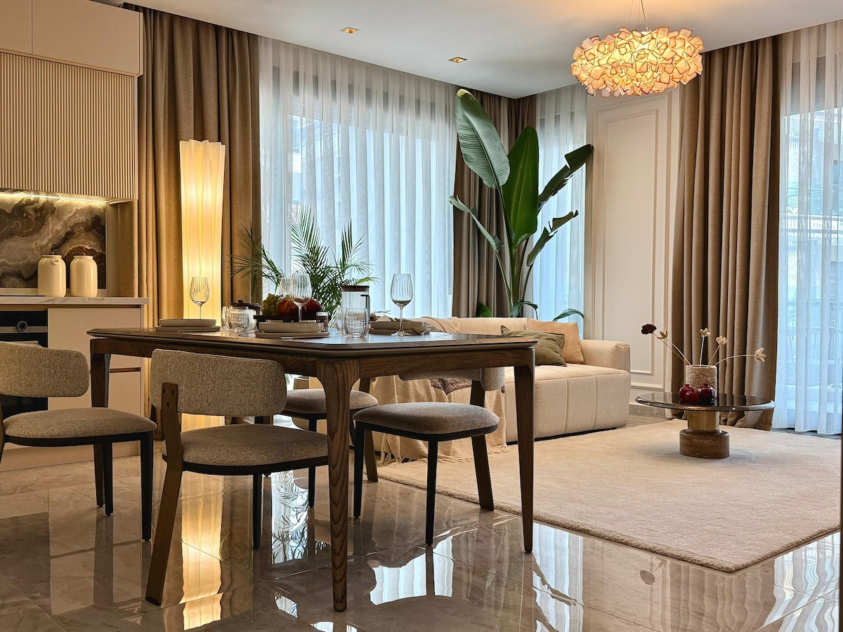 Udobno stanovanje 1+1, 60 m², s sodobno zasnovo in vsem, kar potrebujete za življenje. Nahaja se v kompleksu z infrastrukturo 5. stopnje★: 24-urna varnost, notranje in zunanje parkirišče, karaoke, kino, soba PlayStation, hamam, savna, bazeni. Na voljo imate vse, kar si lahko zamislite za sprostitev in udobje. Stanovanje ima celoten nabor opreme po najvišjih standardih.