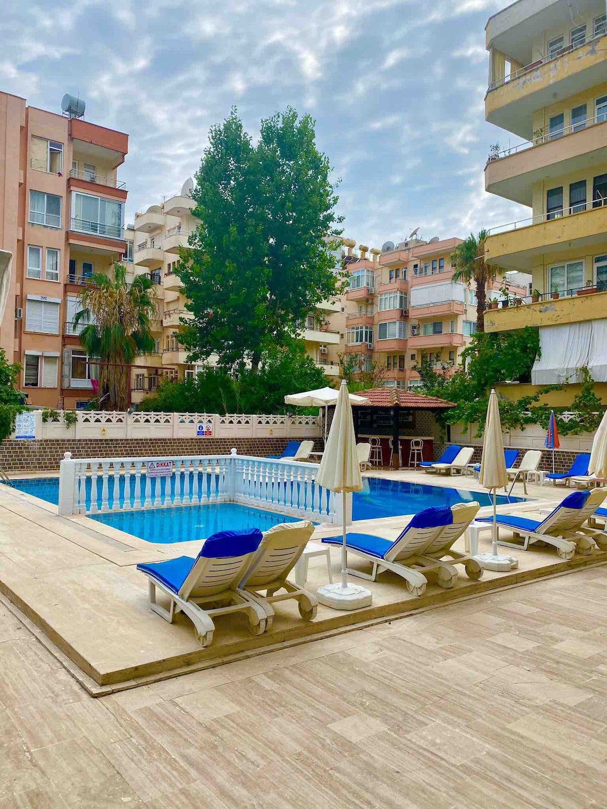 Lovely Beachfront 1 +1 Apt. Rezidenca Lexus (70 m2) z novim pohištvom, dostopom do plaže in pogledom na morje. Celotne sezonske dejavnosti z velikim balkonom, kjer lahko uživate v jutranji kavi in obrokih Samostojni vstop v pametni ključ 7 km do centra in 35 km do letališča Gazipasa. Glede na sezono Velik notranji in zunanji bazen, fitnes, vodni tobogan, teniško igrišče, igralnica, kino salon, otroška igralnica. Soba za zabave, prostor za peko na žaru in varnost 7/24 (turški netopir in savna sta odprti ob koncu tedna)