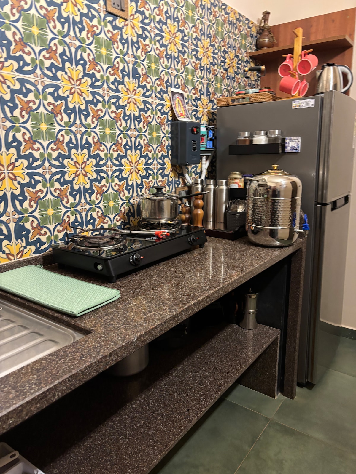 First floor , One Air Conditioned room ( extra charges based on actual AC usage ) with 2 cots and Sleepwell mattress , with private bath , 24 hours hot water, UPS battery back up for lights and fans only (for about 4 hours), Fiber WiFi , fridge , small kitchenette with single burner lpg stove, few utensils , electric kettle,washing m/c , EV charging point.